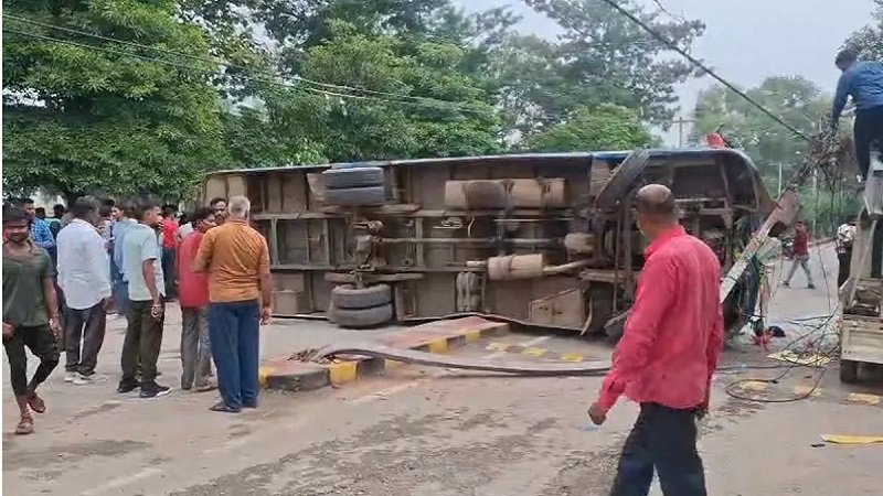 हाटी मोड़ पर बड़ा सड़क हादसा, ऑटो बचाने में अनियंत्रित होकर पलटी बस, यात्रियों में हड़कंप